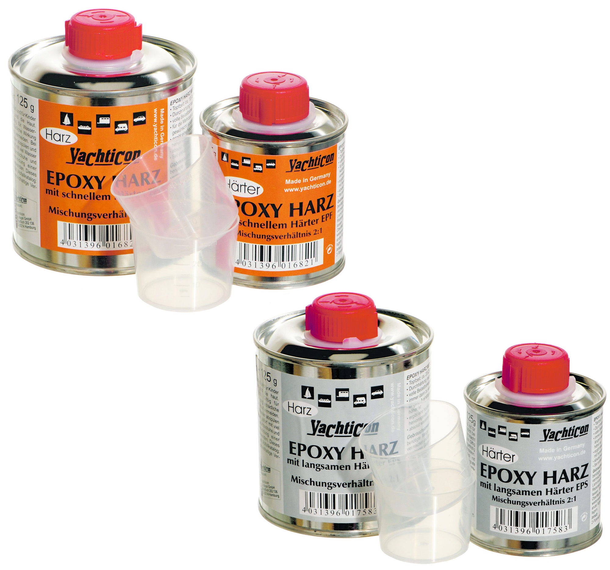 EP Epoxy Harz mit schnellem oder langsamem Härter für Reparaturen, Verklebungen und Laminierarbeiten im Marine- und Outdoorbereich. Härtet bei Raumtemperatur aus und bildet eine hochfeste, feuchtigkeitsabweisende Beschichtung. Ideal für GFK, Holz und vielseitige Anwendungen an Bord.